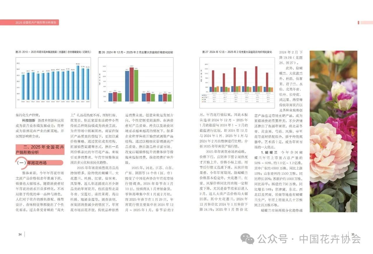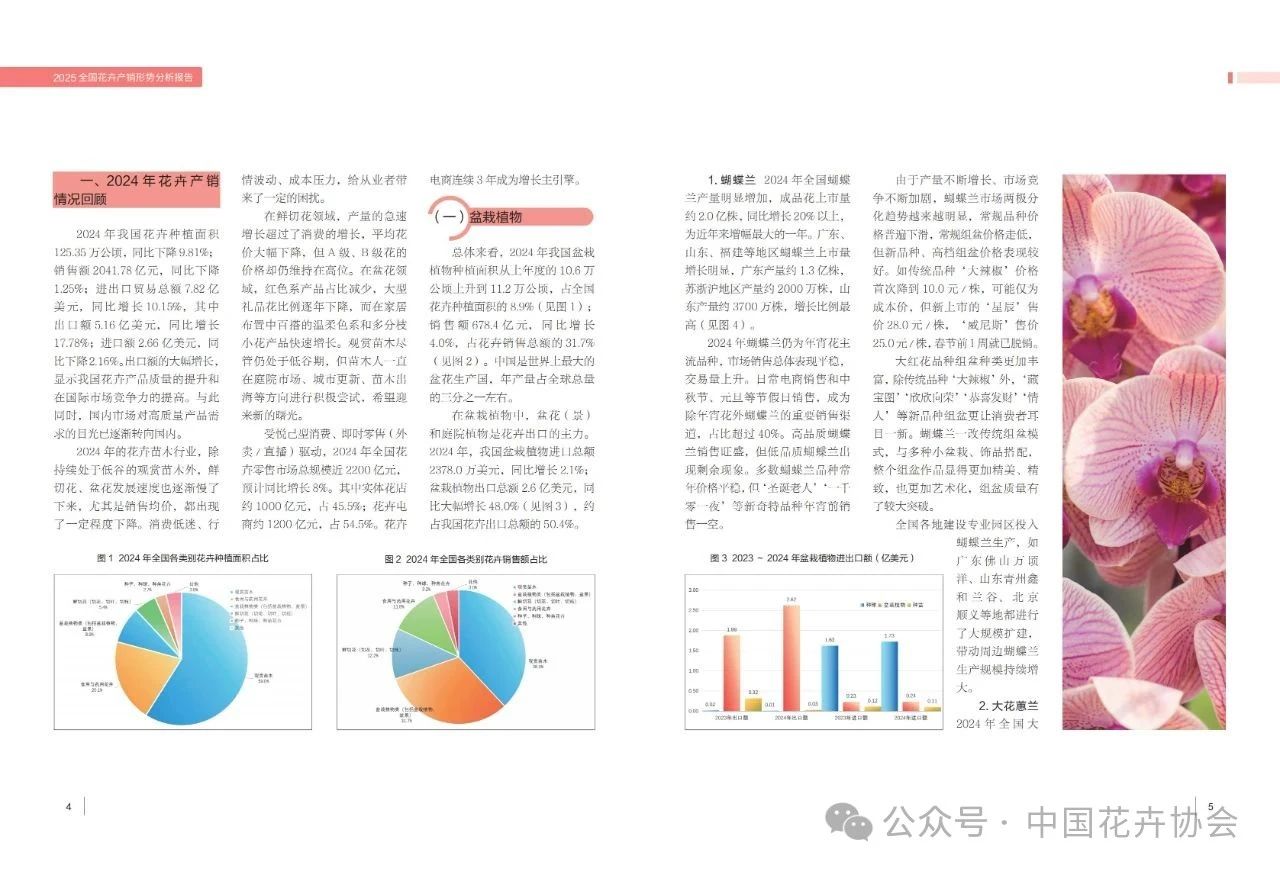 为科学指导我国花卉生产和销售,并为花卉产业发展提供参考依据,中国花卉协会根据“2025全国花卉产销形势分析会”专家报告内容,结合河北、江苏、山东、广东、陕西等省(区、市)的2025年宵花市场情况调查数据,综合分析形成了《2025全国花卉产销形势分析报告》。《报告》分2024年全国花卉产销情况回顾、2025年全国花卉产销形势分析两部分,分别从盆栽植物、鲜切花、绿化观赏苗木、花店零售业、花卉流通等5个方面,对全国产销形势进行了分析及预测,并对2025年蝴蝶兰、大花蕙兰、红掌等年宵花进行了分析总结。